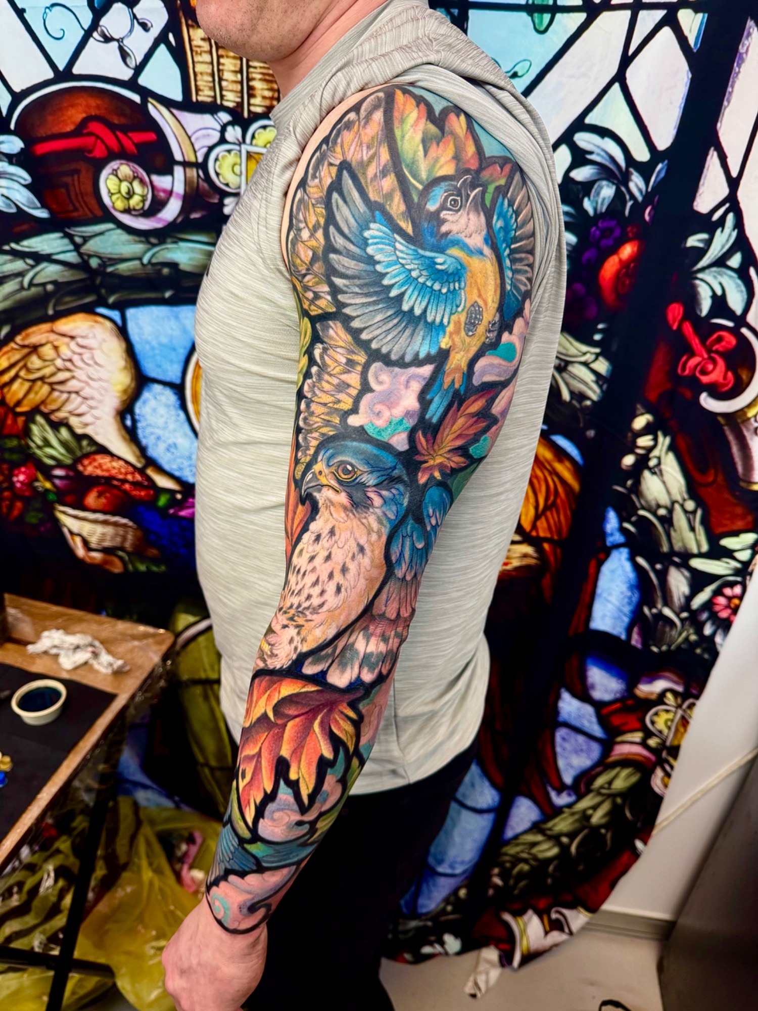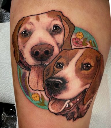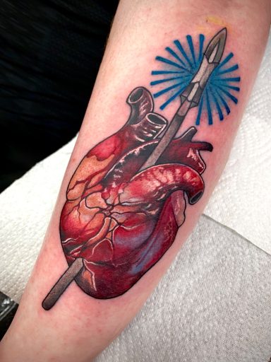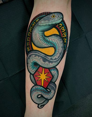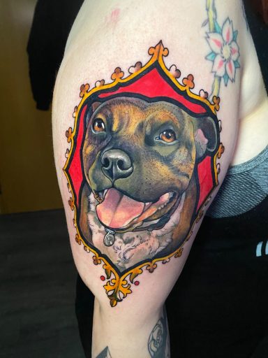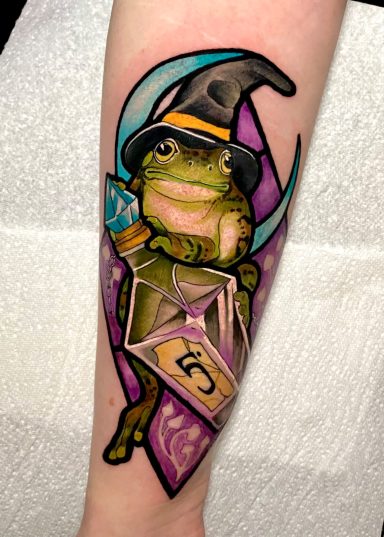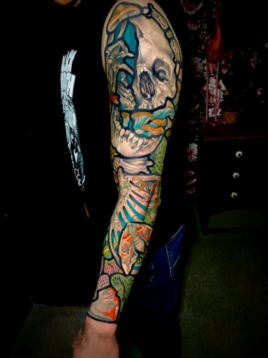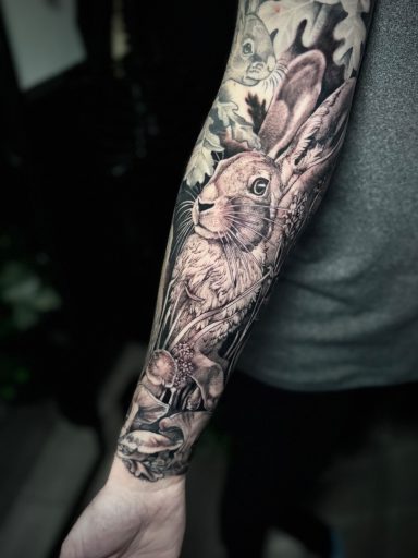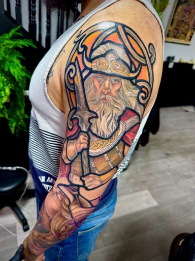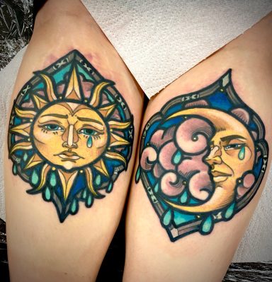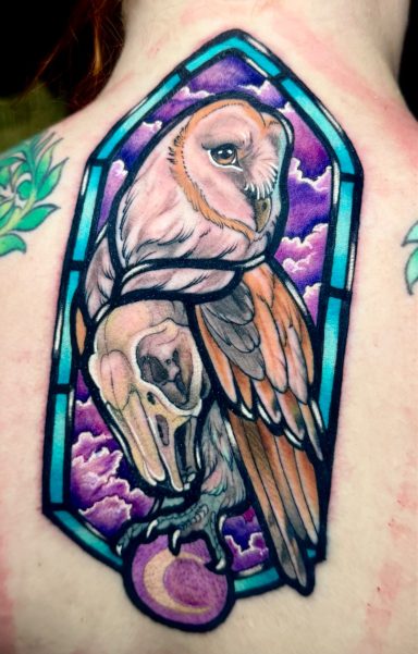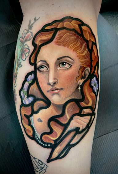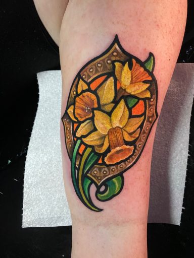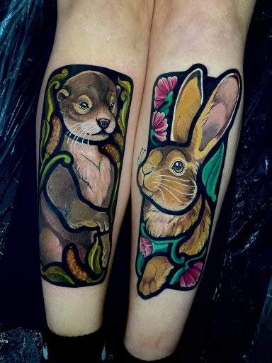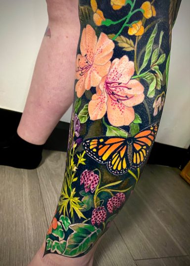 Lauren specialises in vibrant colour tattoos, best known for her distinctive stained glass style tattoos. She loves to take on projects ranging from pet portraits, fantasy and all aspects of the natural world. She has lived in the North of England all her life but travelled and worked guest spots in Europe before meeting partner Alex.